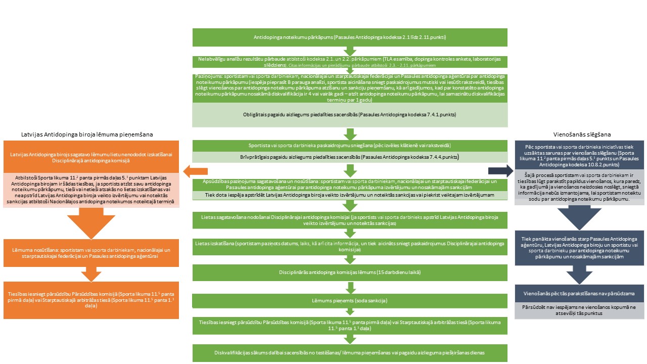 Attēlā atainota shēma, pēc kādas tiek izskatīti iespējami antidopinga noteikumu pārkāpumi, norādot secību, kādā informācija tiek apstrādāta, un sportista vai sporta darbinieka tiesības sniegt paskaidrojumu par situāciju un aizstāvēt sevi Disciplinārajā antidopinga vai Pārsūdzības komisijā. Tā pat norādīts, kurā brīdī (atsevišķos gadījumos) var tikt piemērots obligātais pagaidu aizliegums dalībai sacensībās vai brīvprātīgs pagaidu aizliegums dalībai sacensībās pirms galīgā lēmuma pieņemšanas.
